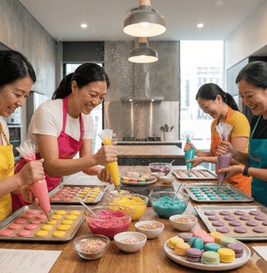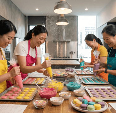Colorful Creations: French Macaron Workshop Step into a world of color and flavor as your team tackles the ultimate French pastry challenge. Forget the intimidation; our chefs make learning fun and accessible in this non-competitive setting. From whipping up glossy meringue to piping the perfect circle and creating luscious fillings, you'll bond over the delicate process of crafting these sophisticated treats.