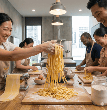 A Taste of Italy: Fresh Pasta Workshop There is nothing quite like the taste of fresh, handmade pasta. In this interactive session, your team will transform simple ingredients into restaurant-quality dishes. You’ll roll up your sleeves to knead dough, crank the pasta machines, and craft classic shapes like Tagliatelle and Fettuccine. It’s a rewarding, carb-loaded bonding session where the best part is eating what you create!